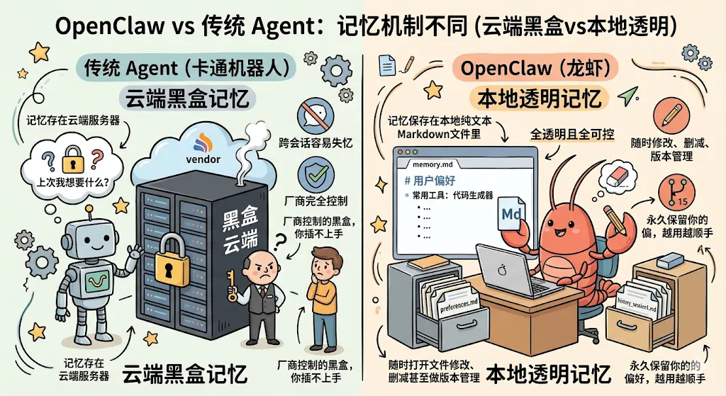 传统 Agent 的记忆存在云端服务器,跨会话容易失忆,而且是个完全被厂商控制的黑盒,你插不上手。OpenClaw 的记忆则是保存在本地的纯文本 Markdown 文件里,全透明且全可控。它不仅永久保留你的偏好,你还能随时打开文件去修改、删减甚至做版本管理,越用越顺手。