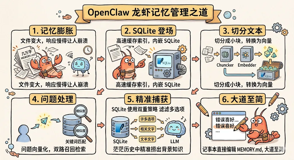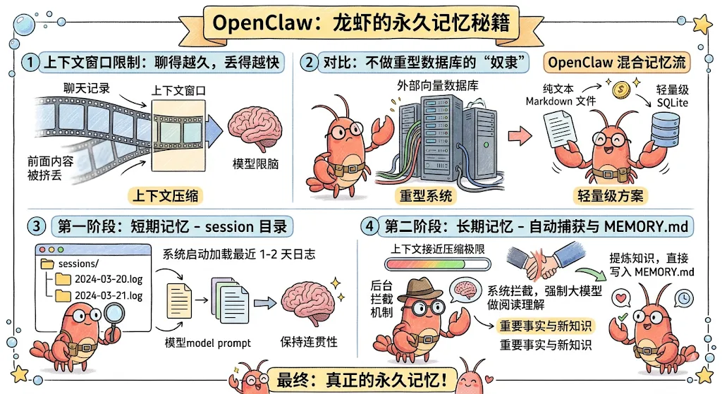 为了解决长文本遗忘,OpenClaw 放弃了重型的外部向量数据库,使用了一套纯文本 Markdown 文件加上轻量级 SQLite 的混合记忆流,实现了真正的永久记忆。