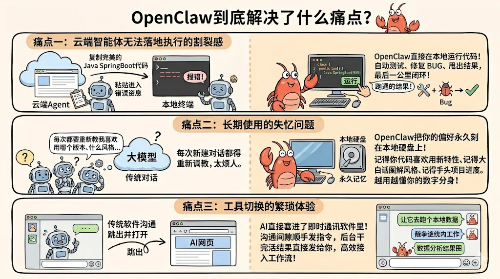 我们要搞清楚一个新技术为什么能火,一定要看它刺痛了什么真实的业务场景。OpenClaw 的出现,其实精准地踩中了开发者和深度 AI 用户的三个死穴。