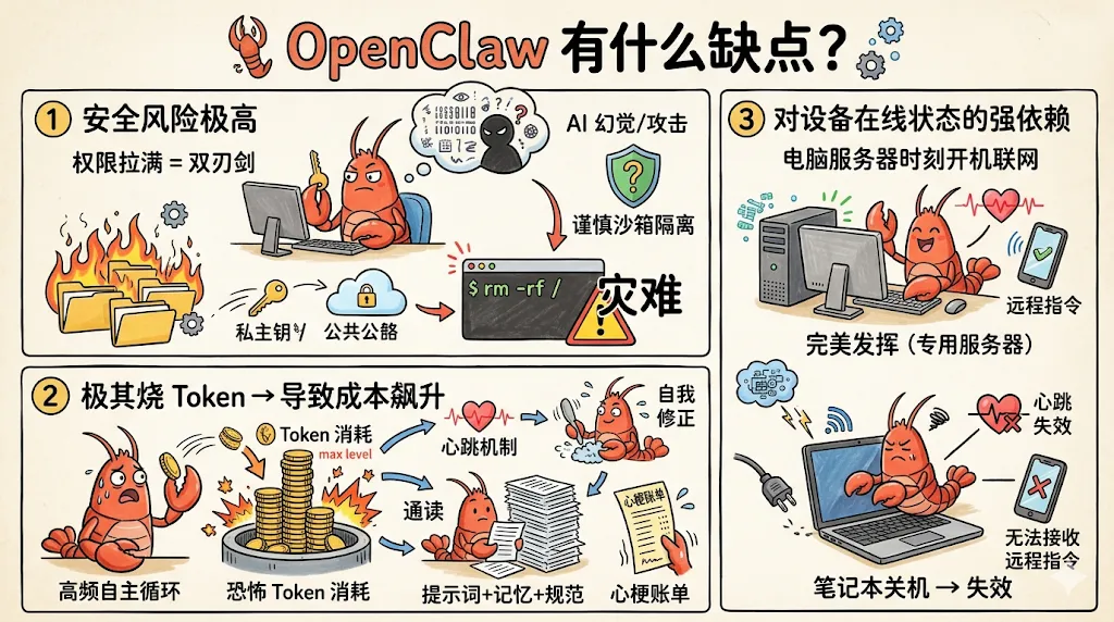 任何技术都不是银弹,OpenClaw 既然拥有了如此逆天的本地权限和极高的自由度,自然也伴随着非常明显的短板。