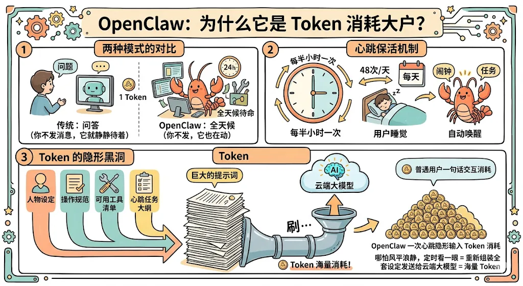 虽然 OpenClaw 能力逆天,但它的聪明是用真金白银换来的。前面我们重点讲了它的心跳机制和自我修正能力。