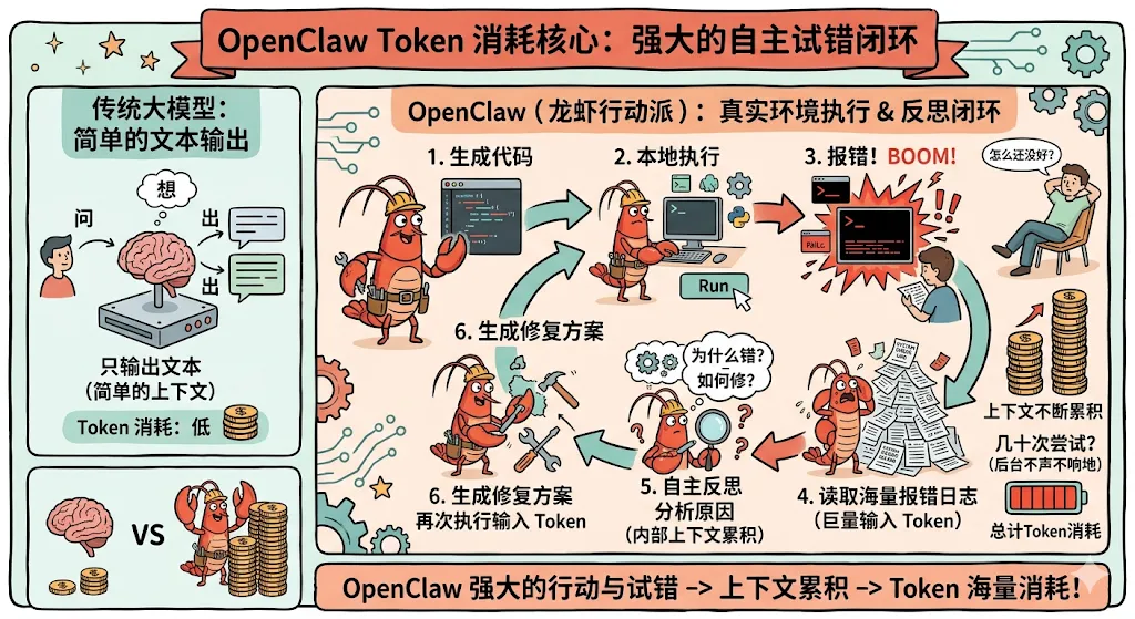 我们让传统大模型写代码,它只要输出一段文本就完事了,消耗非常可控。但 OpenClaw 是真正的行动派,它是要真刀真枪去本地环境里执行的。