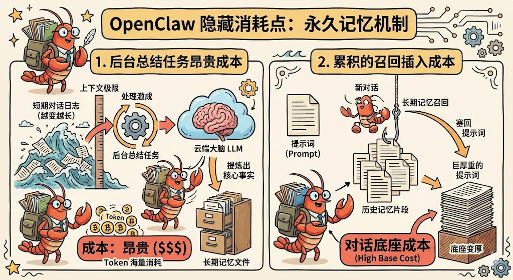 这种动不动就把上万字的文本交给大模型去压缩和总结的操作,本身就是极其昂贵的。而且在后续的对话中,系统又会频繁地把召回的历史记忆片段塞回当前的提示词里,让每一次对话的底座都变得非常厚重。