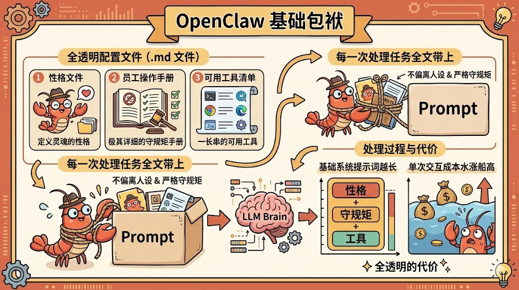 为了保证它不偏离人设且严格守规矩,这套沉重的包袱在每一次处理任务时都必须全文带上。基础的系统提示词越长,单次交互的成本自然就水涨船高。