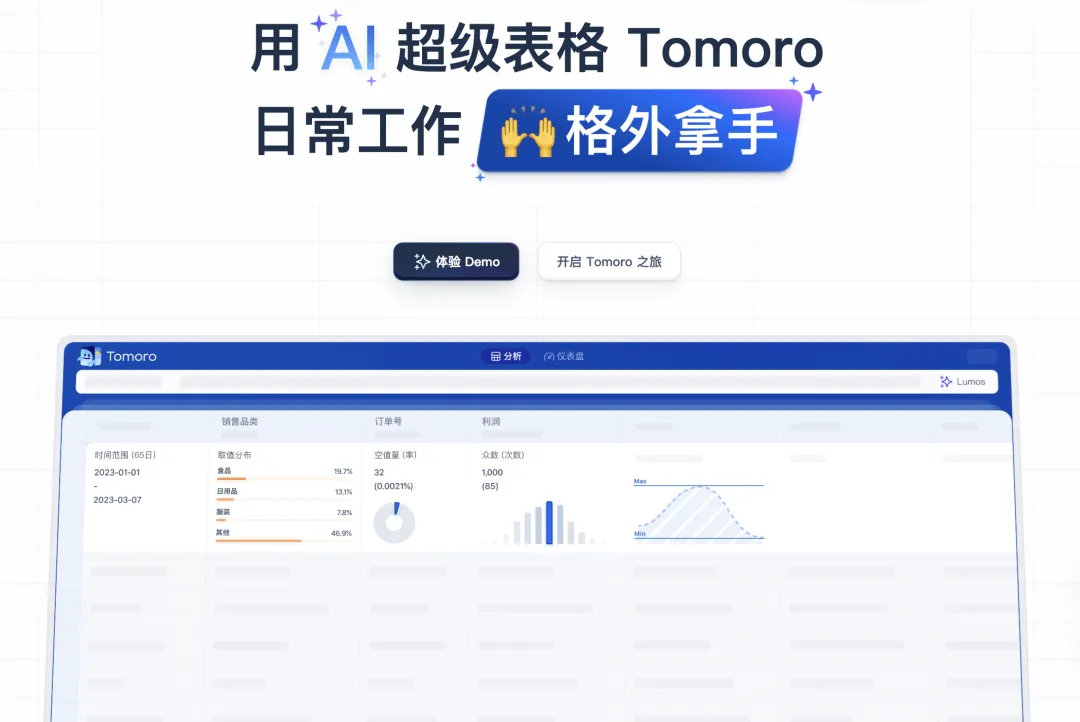 Tomoro是一款AI原生大数据分析工具,前身为腾讯灯塔「WeTable」。它以大众熟悉的电子表格界面,打破传统数据分析的技术门槛,让业务人员与数据分析师均可轻松探索百亿级数据价值。