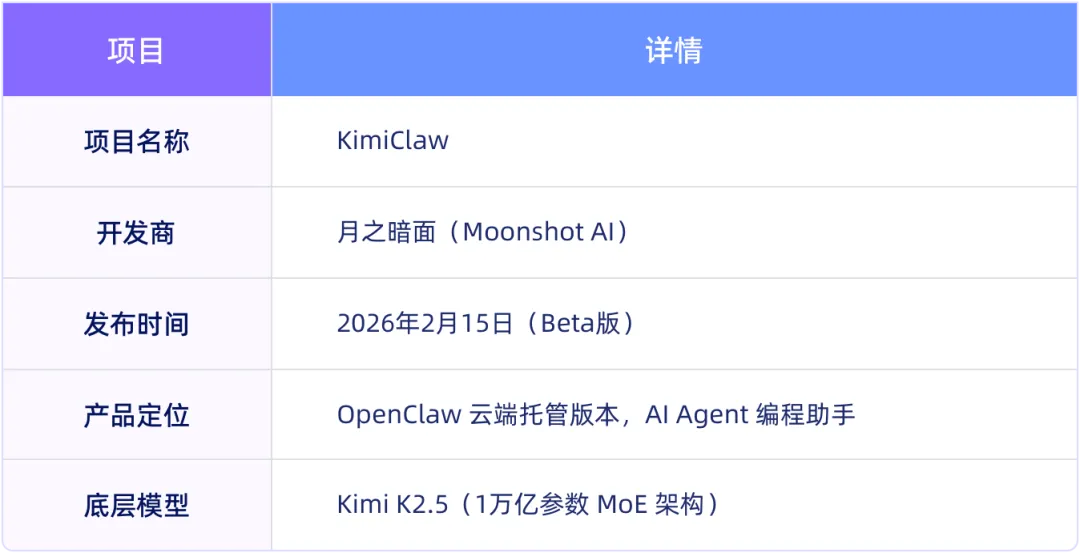 KimiClaw是月之暗面(Moonshot AI)于2026年2月15日正式推出的云端AI智能体服务。作为国内首批基于OpenClaw开源框架的托管产品,它将复杂的AI Agent能力封装为“开箱即用”的云端服务,显著降低了使用门槛。