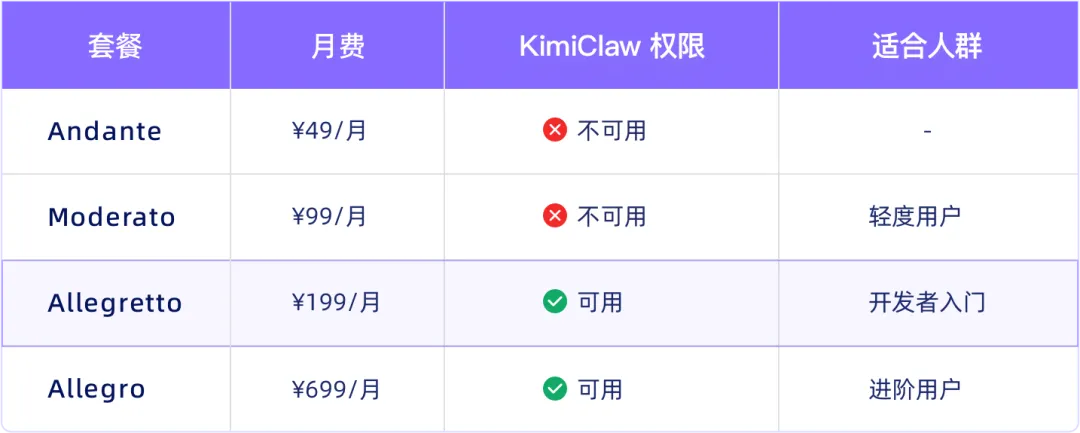 KimiClaw 采用月之暗面音乐术语命名的会员体系,入门门槛为 ¥199/月(Allegretto 计划)。