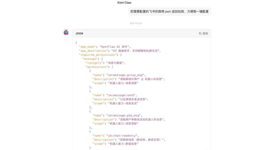 想要 Kimi 返回给我配置飞书的权限 json,结果返回来的结构完全不对。