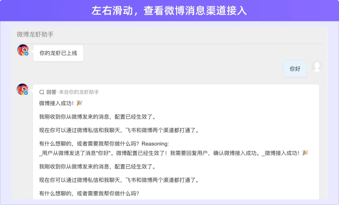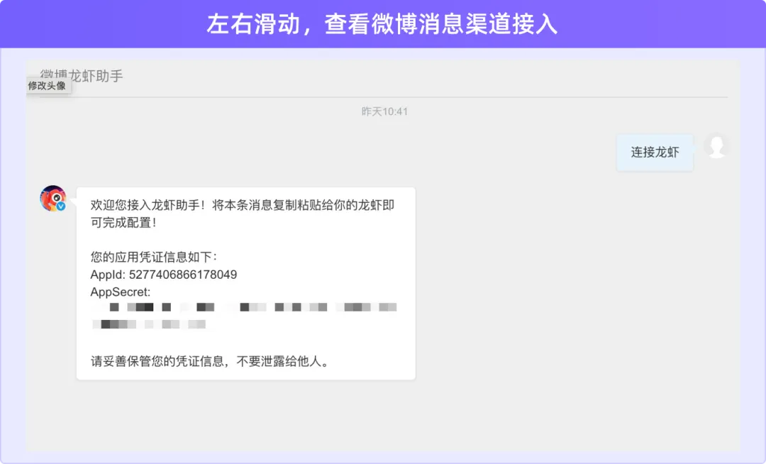 私信 @微博龙虾助手,发送 “连接龙虾”,将收到的 AppKey 和 AppSecret 发送给 Kimi Claw,会自动重启。