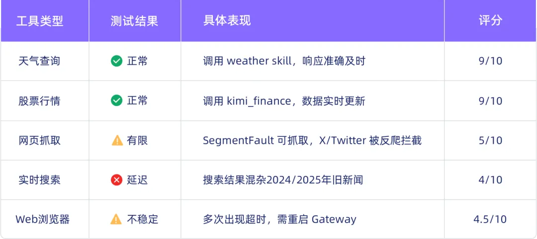 笔者分别测试了几个主流的场景,目前KimiClaw还是有很大的提升空间