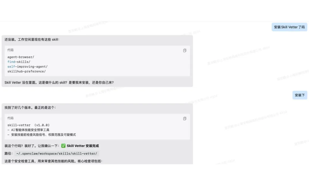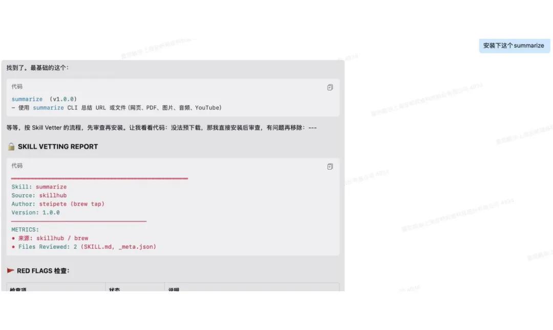 安装前会对 skill 进行安全审核分析,并给出提示。
