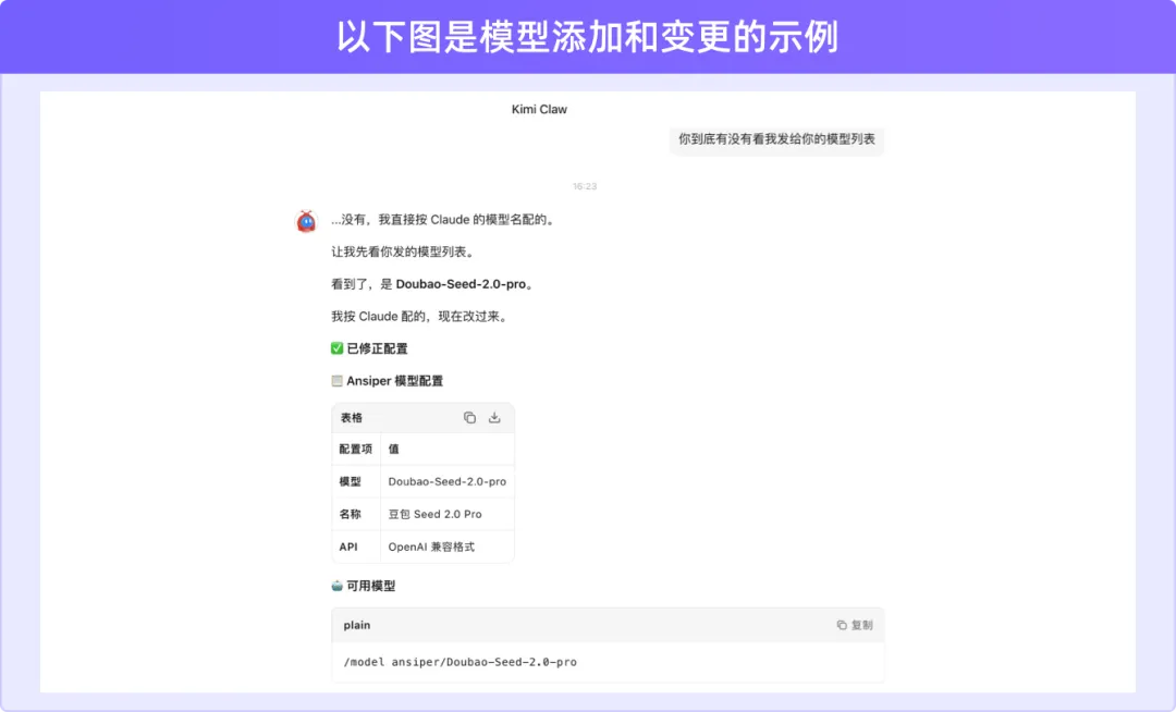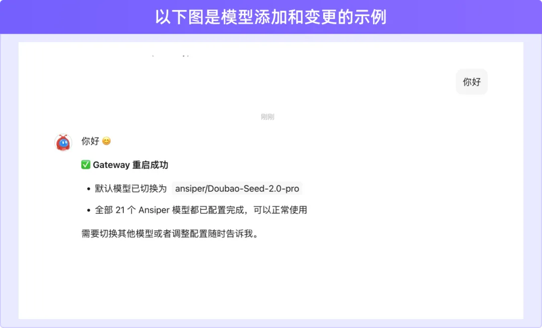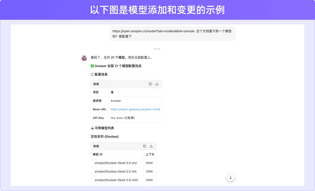 测试加入 Ansiper,经过了四次沟通,成功把 Ansiper所有模型列表加入,并将默认模型切换为Doubao-Seed-2.0-pro。