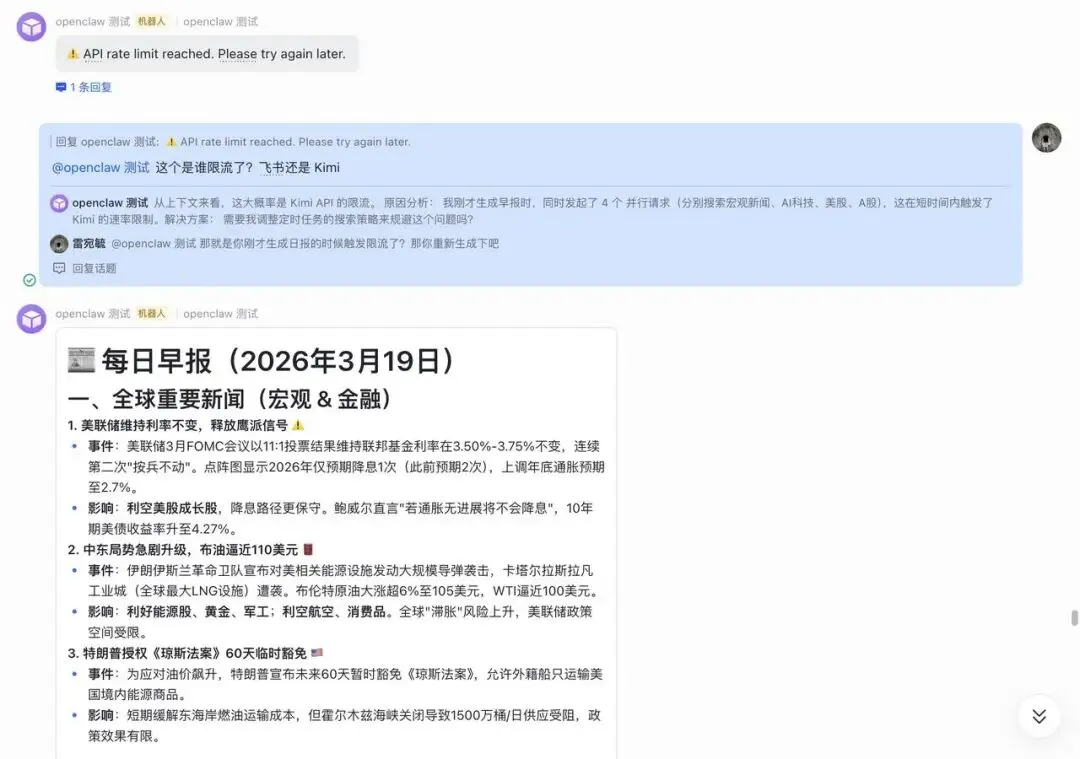每日早报生成,实际生成的内容是比较丰富的。但是在实际触发的时候,触发限流了。