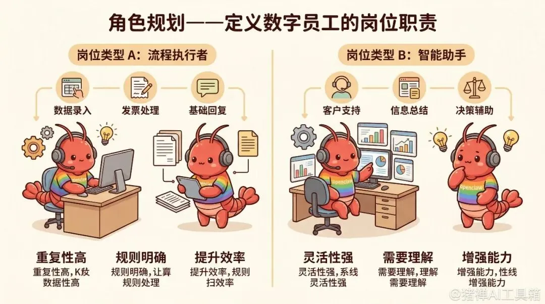 OpenClaw实战:6步打造专属数字员工一台普通电脑,零成本,我多了10个数字员工。试运行一周,原本三天的活,半天搞定。看着它们在群里自动分工、汇报,确实省心。多智能体系统没想象中难,弄懂原理后面就是填空。OpenClaw 核心是 Gateway 架构,一个实例挂多个工作区。这就像大办公室隔成单间,设施共用,各干各的。每个工作区对应一个独立 Agent,有独立的角色和配置。搭建环境本身不难,先备好 OpenClaw 运行环境,WSL2 或 Node.js 都行,注意细节。关键是飞书开放平台的配置,得创建企业自建应用,拿到 App ID 和 App Secret。这块有个坑我踩过:权限配置一定要全,消息接收权限、机器人能力都得开,不然后面哪怕调通了也收不到消息。具体步骤大概是这样:访问飞书开放平台,创建应用,配置机器人权限,再把机器人加到群组里。如果你之前跑通过单机器人的教程,这步会快很多。建议先跑通一个,再考虑批量,别一上来就贪多。我是根据业务流程来划分的,比如我需要爬虫、分析、写报告,那就设了数据专员、分析师、文案策划这几个岗。视频里提到可以根据公司诉求划分,我觉得更准确的说法是:根据任务流来划分。要是你只建一个,命令行交互式创建最快,一行命令跟着提示走就行。但像我这次要建7个,一个个选太磨叽,索性直接改 openclaw.json 配置文件。批量操作改三个关键地儿,复制粘贴比分步交互快多了。很多人总想一步到位,结果哪配置错了都不知道,调试起来非常痛苦。定义角色先把中文名、英文名、定位想好,后面写SOUL文件要用。每个Agent都要配个SOUL文件约束行为,本质上就是个详细的Prompt。我看视频里那个叫「小撒」的产品专家配置得不错,里面有姓名、角色、英文名、工号。加个工号挺好,大模型更有「打工人」的感觉。必须告诉它同事是谁。不写清楚,它就不知道该找谁协作。我试过不写团队成员,它甚至编了个不存在的同事,对着空气输出。还得提一下通讯工具 sessions_send。文件里要写明用法:找目标Agent ID,发消息,等结果。就像教员工用内线电话,教会了沟通才顺畅。不同岗位需求不同,别什么活都扔给 GPT-4。数据专员做提取整理,用便宜模型就行;文案策划和决策分析需要创造力,再上强模型。OpenClaw 支持针对不同 Agent 指定模型,可以用阿里百炼或者火山引擎。配置 openclaw.json 时,给每个智能体设置独立的 ID、名称和工作目录。Windows 下通常在 C 盘用户目录的 .openclaw 文件夹下,每个 Agent 得有自己独立的文件夹存记忆和日志。填好 model 名称和 api_key,既保证效果又控制成本。这块是最容易晕的,因为涉及群聊和私聊两套逻辑。我在配置时发现,必须搞清楚「群组绑定」和「账户绑定」的区别。群组绑定是为了让智能体能接收群消息,参数是 groupid;账户绑定是为了处理私聊,参数是 openid。还有一个挺有意思的配置:响应策略。比如群里有人说话,没 @ 机器人,它要不要回?我的建议是设置为「仅 @ 时回复」,不然几个机器人凑一起,稍微有个风吹草动就刷屏,那场面简直太美不敢看。视频里还提到了 channel 和 account 的区别,这确实是新手坑。简单记就是:群聊找 channel,私聊找 account。把飞书 ID 和系统里的 Agent ID 一一对应好,这个桥梁就算搭好了。我在终端里敲下重启命令,心跳加速地看着日志滚动。果然,第一次跑完美是不可能完美的。我遇到最典型的问题就是「响应错位」:明明 @ 的是智能体 A,结果智能体 B 蹦出来回答了。检查了半天,发现是配置文件里的 ID 绑定写错了位。还有一种情况是 @ 了 A,A 也没反应。这时候要去检查飞书后台的回调地址配置,还有 Bot 的权限是不是漏开了。调试这块需要点耐心,得多看日志。OpenClaw 的日志记录还是挺详细的,哪一步报错、哪个环节卡住,基本都能溯源。解决完这些小插曲,看着群里几个机器人分工明确地干活,那感觉真的像带了一支精兵强将。如果你也想搭建自己的数字团队,点个「在看」告诉我,后台回复「OpenClaw」发你一份我的配置避坑指南。