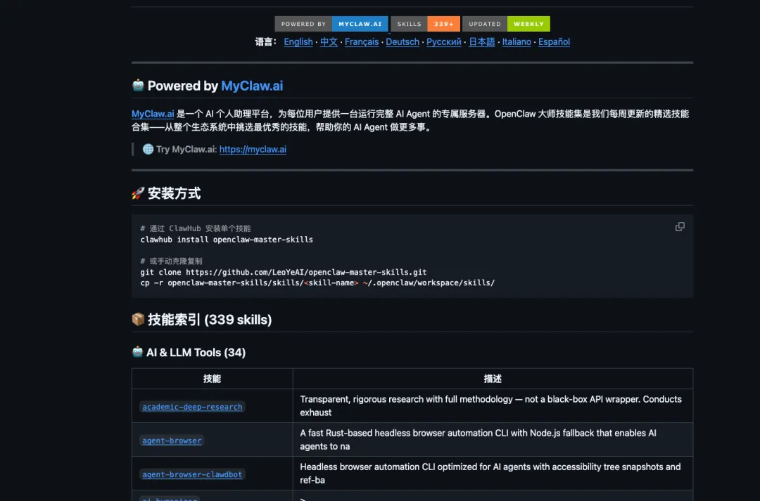 OpenClaw Master Skills 是由 MyClaw.ai[1] 团队维护的精选技能库,汇集了来自 ClawHub、GitHub 和社区的 339+ 个最佳 OpenClaw 技能。这些技能涵盖了 AI、生产力、开发、营销、金融等多个领域,让你的 AI 代理真正做到"无所不能"。