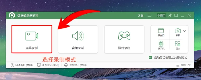 步骤1:先打开数据蛙录屏软件,进入软件主界面。在开始录制前,需先确认录制范围需求,是全屏幕录制还是特定窗口录制。明确需求后,选择对应的录制模式。本教程以最常用的屏幕录制模式为例,其他模式的操作方法大致相同。