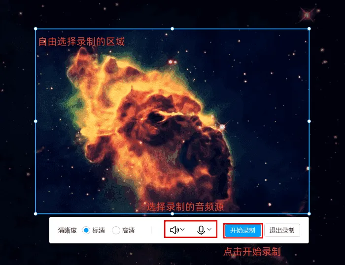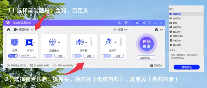步骤2:选择好录制模式后,可通过拖拽边框的方式调整录制区域大小,直至符合需求。声音录制方面,根据实际需要勾选对应选项:录制人声勾选麦克风,录制电脑声音勾选扬声器,两者都需则全部勾选。