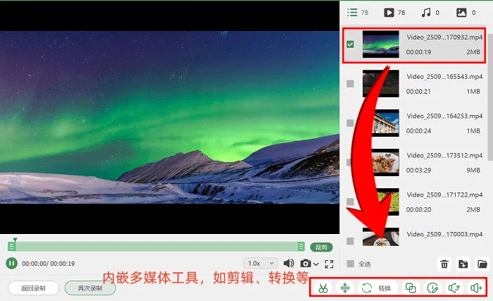 声音录制方面,这款免费录屏软件电脑版支持灵活设置,可单独录制系统音、单独录制麦克风声音,也可同时录制两者,保证音频内容的完整记录。另外,软件自带后期处理工具箱,录制完成后,无需借助其他软件,就能完成片段剪辑、转场添加、格式转换和文件压缩等后期操作,提升使用便捷性。
