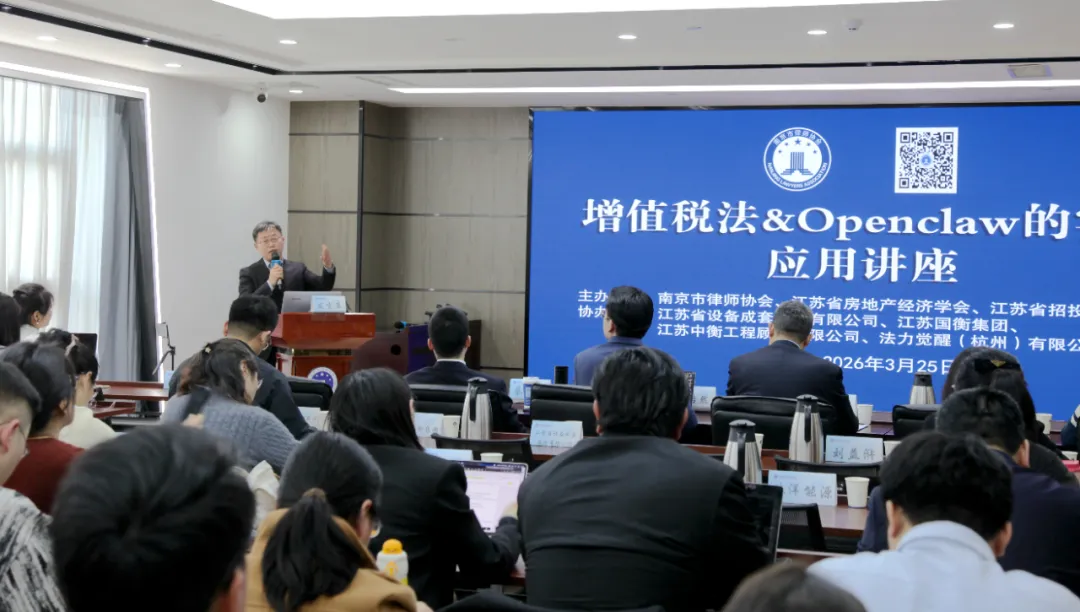 为助力房地产、建设工程领域企业精准应对《增值税法》实施后的合规挑战,拥抱数字化服务新趋势,2026年3月25日,由江苏省房地产经济学会联合南京市律师协会、江苏省招标投标协会共同主办的“增值税法新规解读&OpenClaw实战应用专题讲座”,在南京市律师协会报告厅顺利举办。活动由学会法律专业委员会和南京律协招投标与政府采购专业委员会牵头组织,全程彰显学会专业服务能力,呈现了一场干货满满的专题分享。本次讲座的支持单位有:江苏省设备成套股份有限公司、江苏国衡集团、江苏中衡工程顾问有限公司、法力觉醒(杭州)科技有限公司。