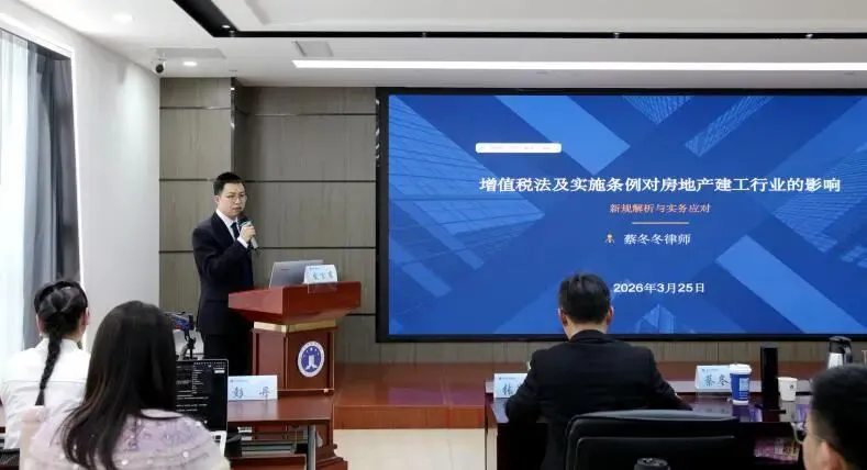 本次讲座,首先由江苏省房地产经济学会法律专业委员会委员、北京市尚公(南京)律师事务所的蔡冬冬律师主讲,蔡律师兼具律师、注册会计师、税务师及证券从业资格等多重资质,深耕财税、基金、公司治理等专业方向,蔡冬冬律师围绕《增值税法》及实施条例,结合房地产、建设工程行业实际场景,进行了全方位、深层次的政策拆解。重点解读了纳税主体、征税范围、税率体系、税收优惠等核心调整,针对行业高度关注的土地价款扣除、工程甲供材料计税、纳税义务发生时间、进项税额抵扣等关键事项,结合真实稽查案例逐一剖析风险点,并给出可落地的合规应对方案,为参会企业财税合规提供了一站式操作指引。