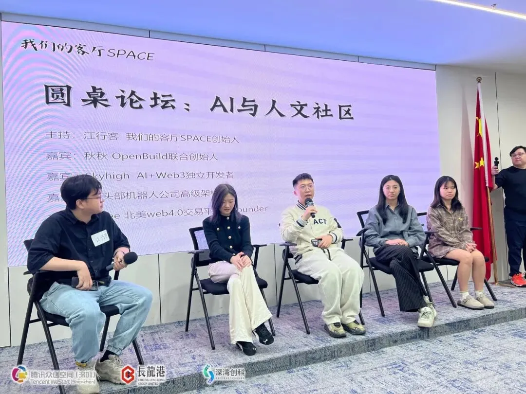 主题分享后,我们的客厅SPACE创始人江行客担任主持,与秋秋、Skyhigh(AI+Web3 独立开发者)、Jo(头部机器人公司高级架构师)、Fanee四位嘉宾,围绕AI 与人文社区展开深度探讨。