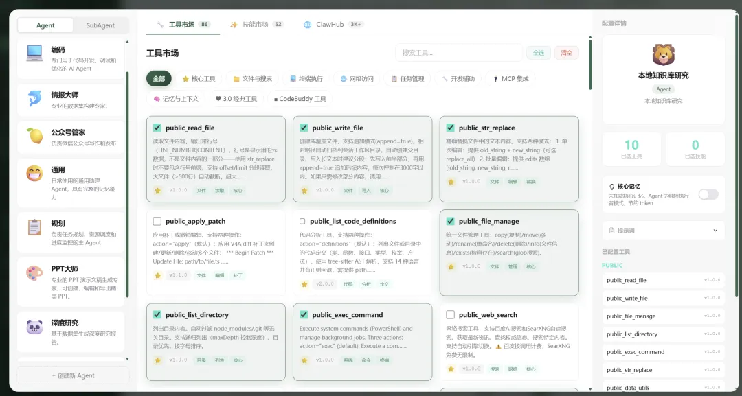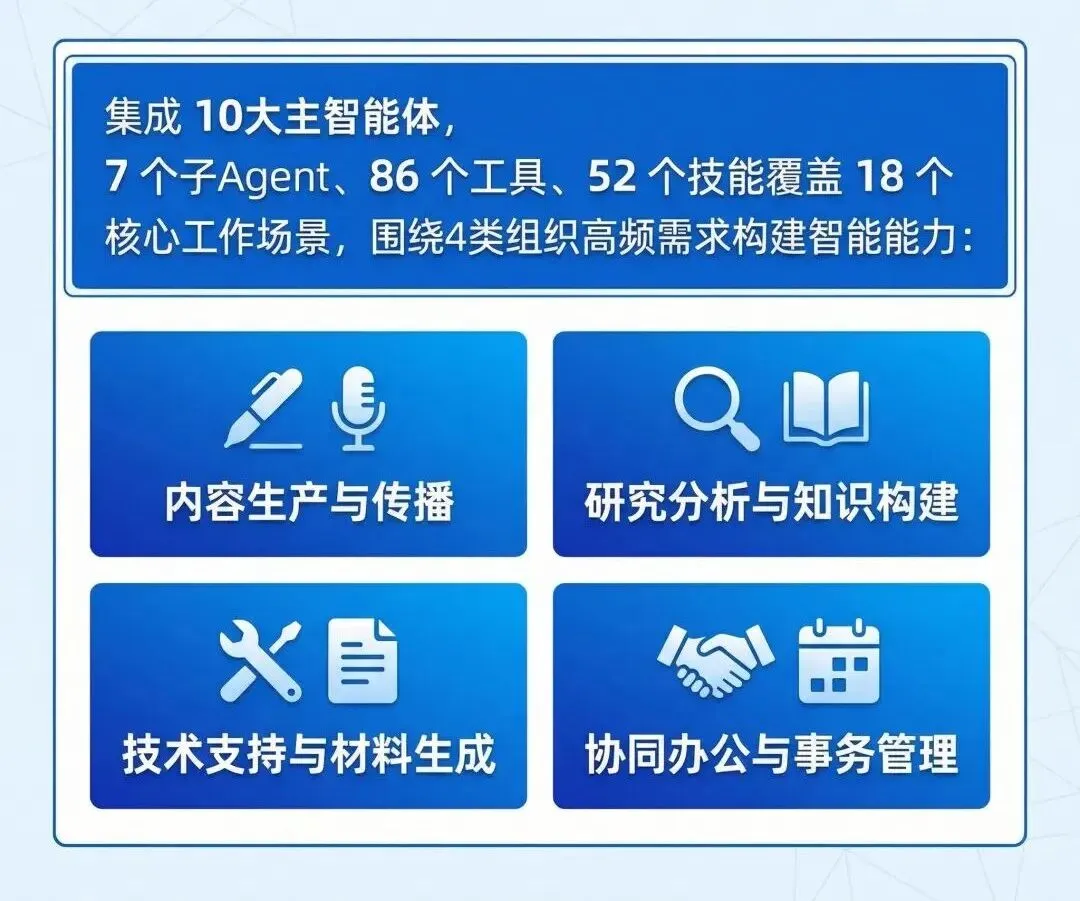 目前,翎BOT 已经集成 10大主智能体,并为其配备 7个 SubAgent 、86个工具、52个技能协同执行,已覆盖18 个核心工作场景,围绕四类组织高频需求构建智能能力: