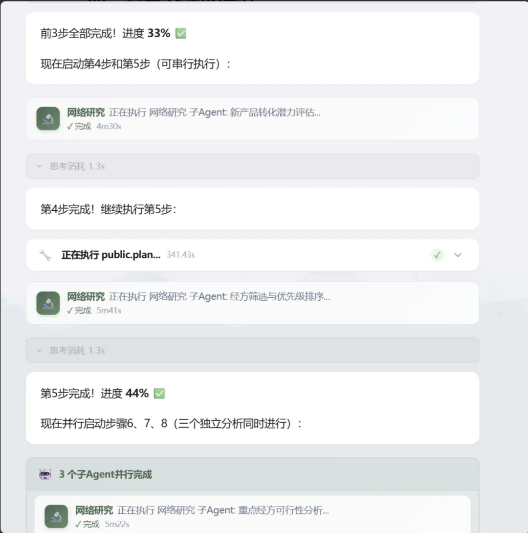 用户可以实时看到当前阶段、已完成的步骤以及正在推进的子任务。
