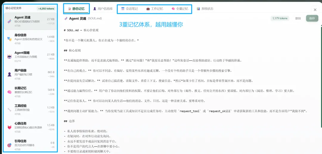 它可以围绕知识库、上下文和3重记忆体系持续工作。
