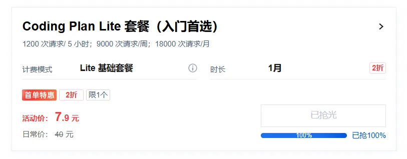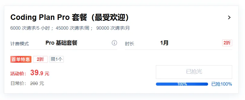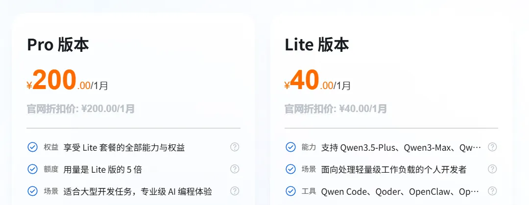 阿里这个套餐,跟腾讯的定价体系差不多,Lite套餐日常40块一个月,新客首月10块钱。Pro套餐日常200块一个月,新客首月50块。用量上Pro也是Lite的5倍,跟腾讯持平。