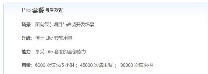 用量方面,Lite套餐每5小时最多1200次请求,每周9000次,每月18000次。Pro套餐直接是Lite的5倍,每5小时6000次,每月90000次请求。对轻度用户来说,Lite的额度完全够用,重度开发者买Pro也能顶得住。