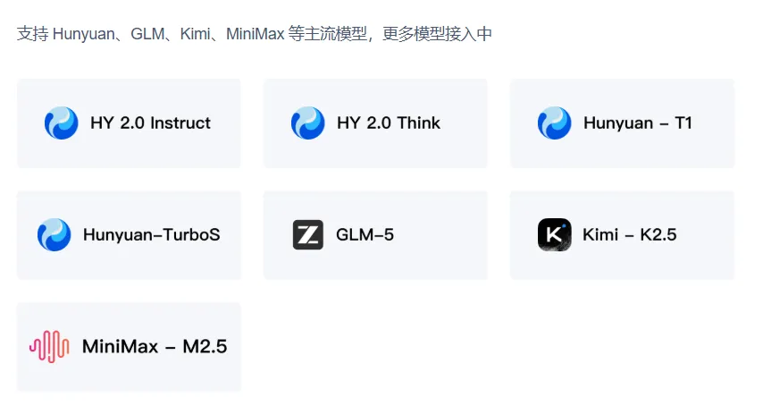 模型方面,除了独家支持腾讯的混元全系列模型,还接入了GLM-5、Kimi-K2.5、MiniMax-M2.5这些主流模型,主流编程工具几乎全兼容,OpenClaw、CodeBuddy、Cursor这些都能直接用。唯一要注意的是,这个优惠价每天10点限量开抢,手慢无,想购买的朋友要定好闹钟!