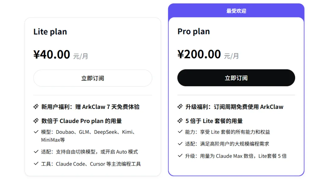 字节这个套餐,最大的亮点,就是独家支持豆包系列代码模型,尤其是在国内代码模型里属于第一梯队的Doubao-Seed-Code,而且现在订阅还能解锁字节刚出的ArkClaw,跟OpenClaw完美适配。