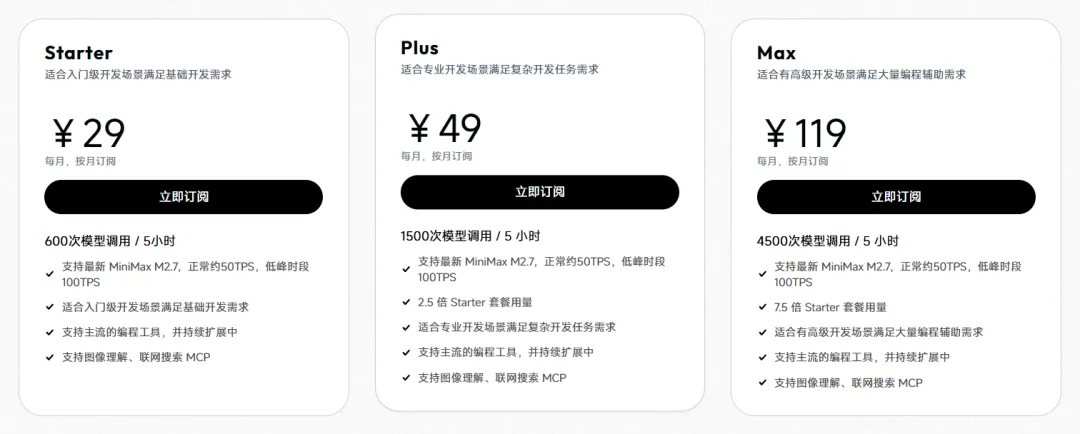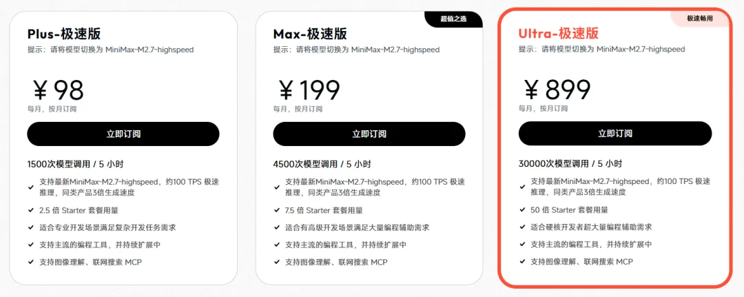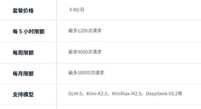 套餐的核心优势呢,是MiniMax自家的M2系列模型,它在代码生成和工具调用上表现很稳,尤其是长上下文的代码理解,效果很不错。缺点也很明显,只支持自家的MiniMax系列模型,不支持第三方模型,如果你只用MiniMax,选它没问题,想换模型的话就不太方便了。