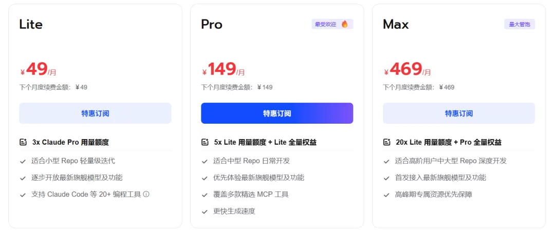 它的套餐分了三档,Lite、Pro、Max,Lite是Claude Pro的3倍用量,Pro是Lite的5倍,Max是Pro的4倍,能覆盖从入门到重度开发的所有需求。而且它支持智能调度,简单任务自动用轻量模型省额度,复杂编程自动切旗舰模型,非常省心。