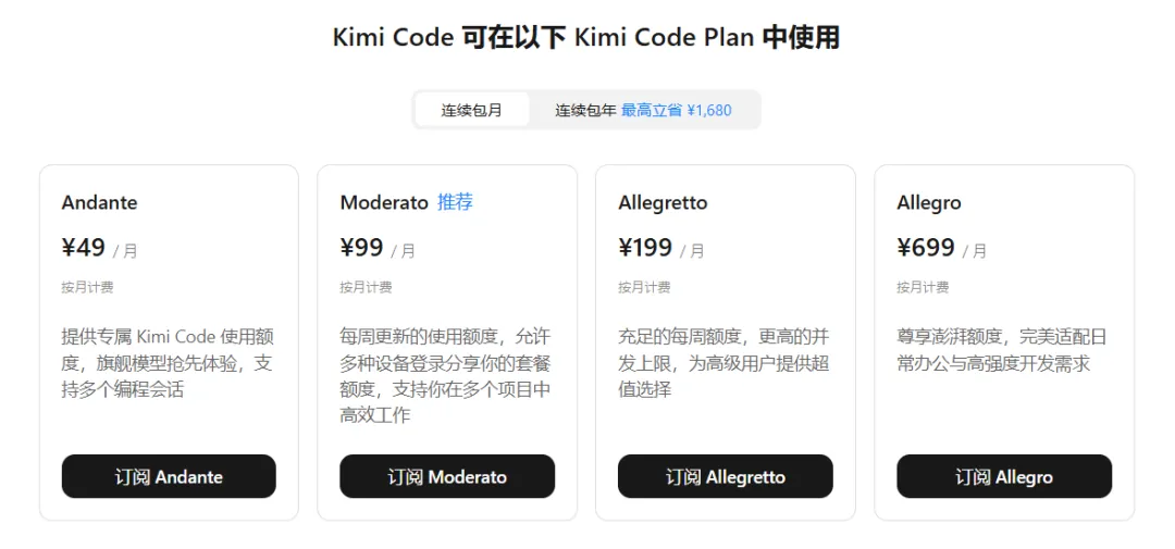 这里要跟大家说清楚,Kimi其实没有单独的Coding Plan,它的Coding功能,是包含在Kimi会员体系里的。会员分了四档,从49块一个月的Andante,到699块一个月的Allegro,不同档位对应不同的用量限额。