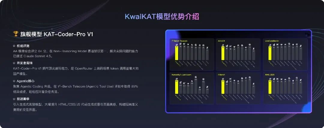 这个套餐,可能很多朋友没听过,它是快手万擎平台出的,核心是自家的KAT-Coder-Pro V1模型。这个模型在AA榜单的非推理模型赛道拿过第一,前端代码生成的美感和实用性,做得特别好,如果你是前端开发者,可以关注一下。