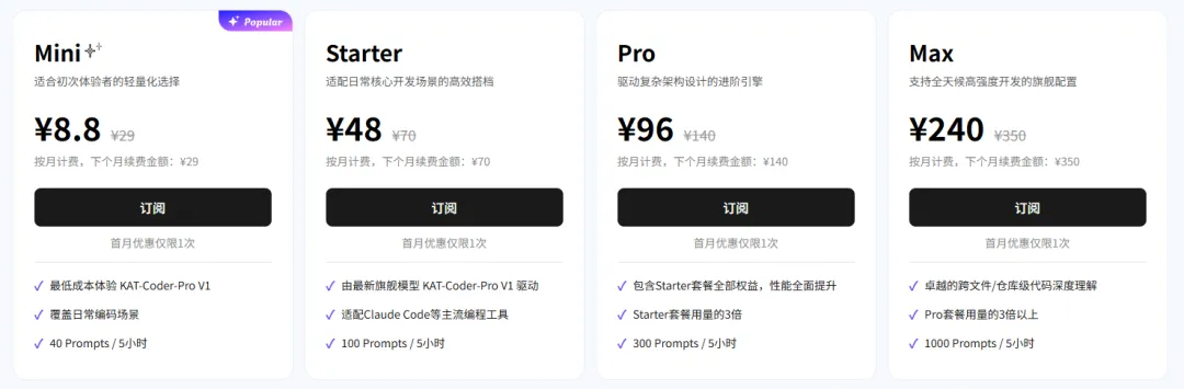 价格方面,入门的Mini套餐,日常29块一个月,限时特惠首月8块8,每5小时40次prompt。最高的Max套餐,日常350块一个月,限时特惠240块,每5小时1000次prompt,重度开发也够用。缺点还是只支持自家的KAT系列模型,不支持第三方,生态丰富度不如大厂。