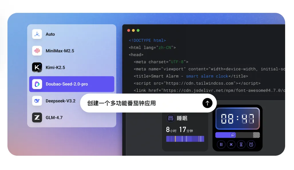 模型生态也很能打,除了豆包全系,它还接入了Kimi-K2.5、GLM-4.7、DeepSeek-V3.2这些热门模型,支持手动切换,也能开Auto模式智能调度,简单任务用轻量模型省额度,复杂任务用旗舰模型保效果,非常智能。而且它对Claude Code的适配做得特别好,官方教程非常详细,新手也能一步到位配置好,不用踩坑。