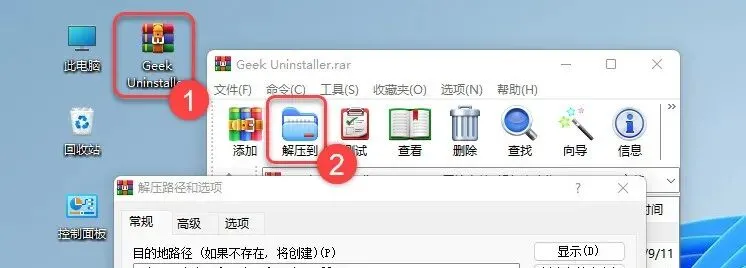 1.解压安装包:①双击【Geek Uninstaller】压缩包②点击【解压到】③点击【确定】。