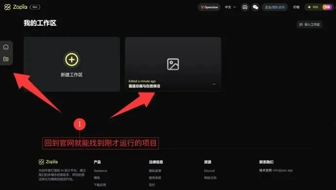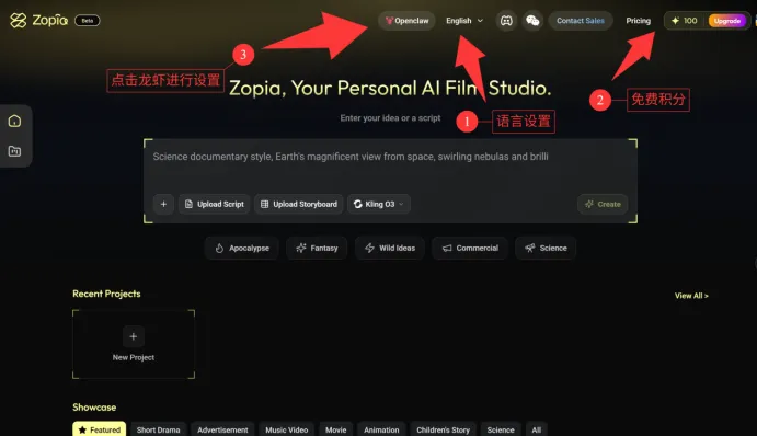 因为Zopia官网默认语言是英文,大家不习惯的话,可以按照下面的方法切换到中文,而且新注册用户会送一百免费积分,这个后面会有很多用处,然后点击OpenClaw小龙虾进行下一步。