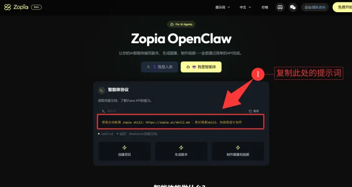 在Zopia官网上点击了OpenClaw小龙虾进行下一步之后,就需要获取并安装相关的Skill,才能够让Zopia和OpenClaw小龙虾联动起来为你干活。