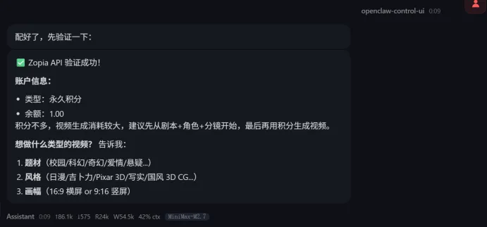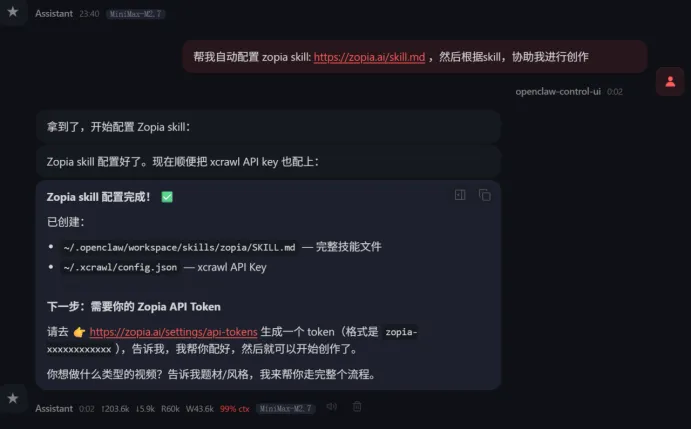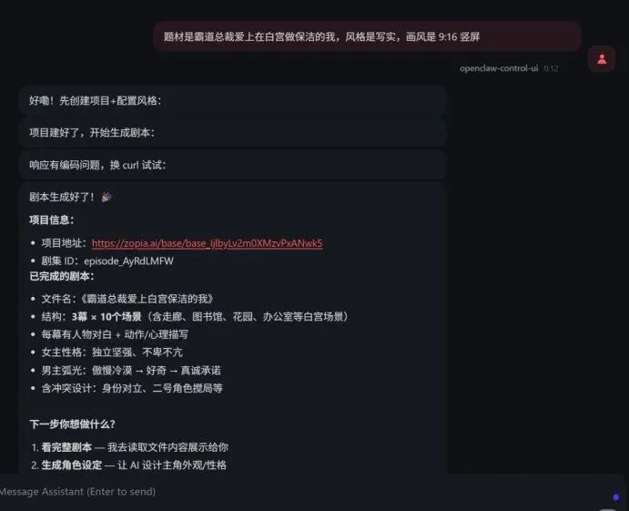 这样,整个自动化链路就已经搭建完毕!此时,OpenClaw已经拥有了调用Zopia生成短剧的完整权限。接下来,我们试一下效果。