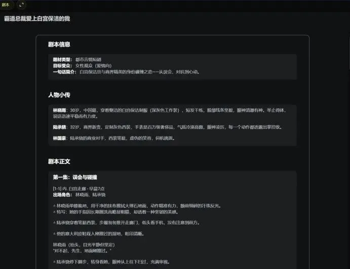 1、全自动流水线:你只需要输入一句简单的创意(例如“霸总爱上我”或“重生之我在古代当首富”),剩下的剧本撰写、角色设定、分镜绘制到最终视频生成,全部由AI自动完成。