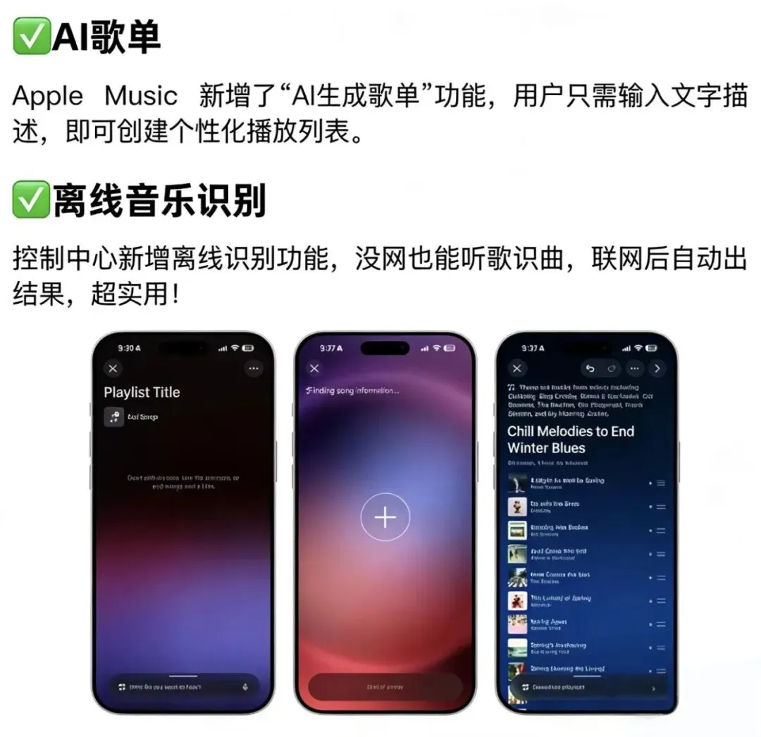 音乐相关动静也大,控制中心多出音乐识别的开关,没有网络时先存声音指纹连上再出结果,飞机上听广播或咖啡店碰见一段旋律先记下来不耽误,专辑和歌单页面铺满动态背景,颜色和节奏跟着封面走,刷起来更沉浸,主屏放上环境音乐的小组件,安睡专注放松这些分类摆在那,一按就开一个场景,耳机戴上办事或入睡更顺手。