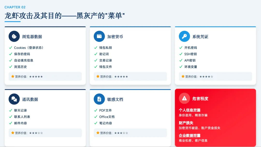 当前,龙虾等部分AI Agent产品在高权限运行、外部攻击诱导、技能调用审核等方面仍存在一定风险。例如,相关产品通常需要较高系统权限安装和运行,部分场景下还可调用本地程序、执行命令并自动安装程序或技能;与此同时,黑灰产也会借助其热度,通过仿冒安装包、钓鱼链接、恶意代码等方式发起攻击,目标往往指向浏览器数据、系统凭证、API密钥、聊天记录及本地文档等敏感信息。
