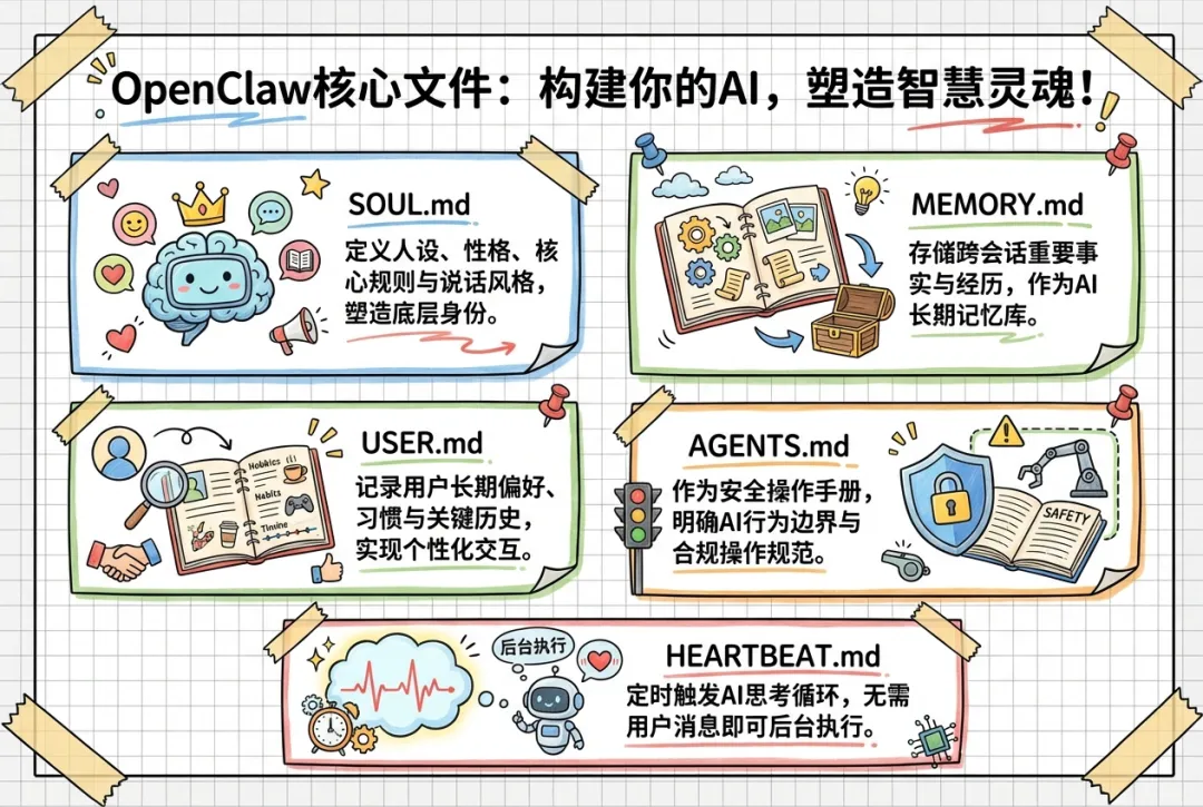 Agent 的分层架构在 OpenClaw 中都有具体的物理载体或功能模块。比如 SOUL.md、 USER.md、MEMORY.md、Skills、MEMORY.md等