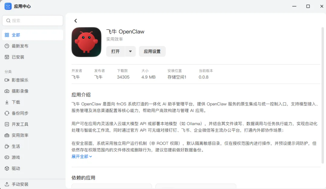 但就在昨天(3月26日),飞牛官方直接放了个大招:OpenClaw原生应用上线应用商店了。