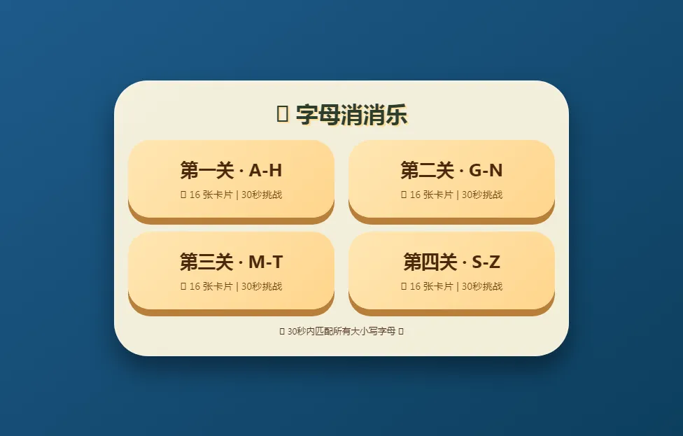 汉语拼音字母表大小写匹配消消乐游戏下载,一年级家长来看看!汉语拼音字母表,一年级的小朋友背得可熟?大小写匹配是汉语拼音字母表最重要的考点之一,这道题目可是要从一年级考到六年级,只要是查字典的题目,基本上都会考个一分两分的。对一年级的的孩子来说,抄抄写写是一件无趣的事情,要是练习可以像游戏一样就好了!哎呀!那你可真是找对人了。陈老师刚刚就做了一个这样的小游戏,专门用来练习汉语拼音字母大小写的。一、以下是字母大小写匹配消消乐游戏的设计思路1.训练专注力和字母大小写消消乐是专门用来训练观察力和反应能力的游戏。把字母大小写匹配做成消消乐,寓教于乐,一举两得。30s的倒计时,够不够用呢?对于不熟练的小朋友来说肯定是不够用的,但是对于熟练的小朋友来说匹配8个字母是绰绰有余。请看:2.减少重复性的书写字母大小写匹配其实一个很小的知识点,孩子会出错的往往也就是个别字母,并不存在全部都不会的情况。有了这个小游戏,可以避免重复的抄写,重复的练习,孩子的学习积极性大大提高了,学习效率大大提高了。二、以下是字母大小写匹配游戏的使用方法:1.把游戏下载到自己的手机上:方法1:自己下载点下面的链接进入下载页面字母大小写匹配消消乐.html点下载到我的微信——>转发给微信——>选择聊天文件传输助手方法2:加群我发给你2.打开方法方法1.在手机本机上打开在用QQ浏览器中打开方法2:在电脑上打开三、知识类游戏设计与开发茵苗教育,让学习更有趣!这不仅仅是一句口号,更是作为一名一线教师致力研究的课题。每天坚持陪孩子学习十分钟,影响孩子的一生。