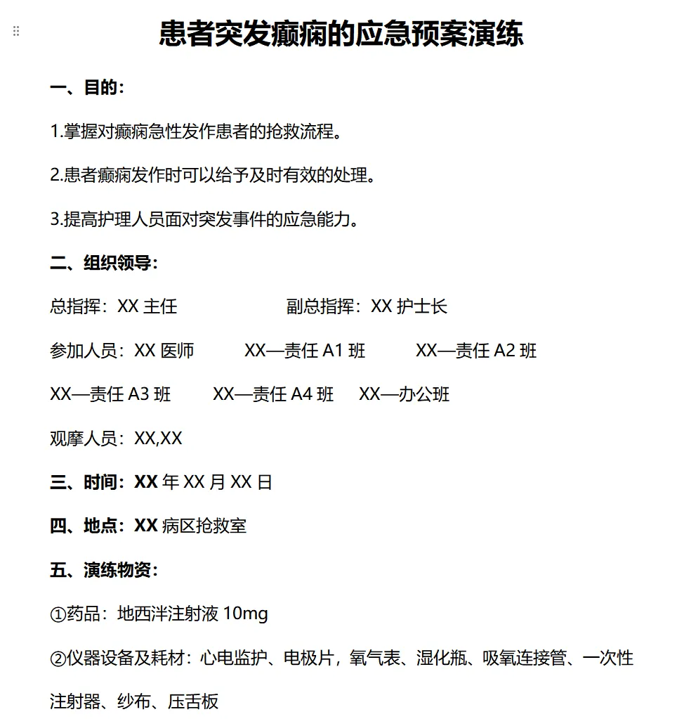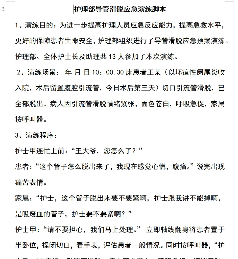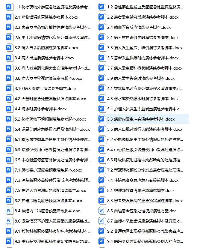 今天分享给各位护士姐妹们一份护理应急演练大全!一共51份,涵盖各科室各种护理意外的应急处理演练脚本。