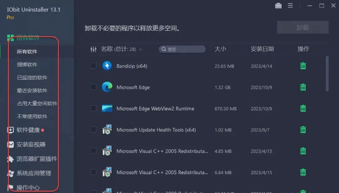 :支持通过关键词搜索目标程序,也可按 “文件大小”“更新日期”“安装时间” 等条件筛选,帮助用户快速定位需处理的软件。